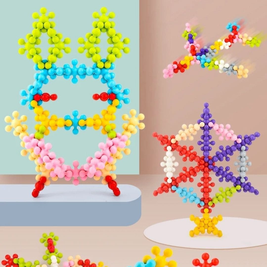 L’enfant peut créer des fleurs, animaux, tours, structures géométriques ou formes totalement inventées. Un vrai terrain de jeu pour l’imagination.