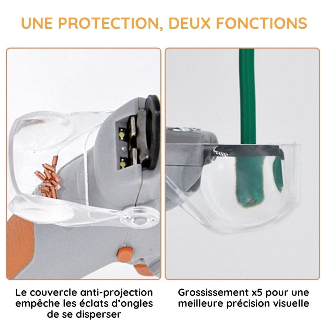 Fini les approximations ! La loupe intégrée à 5x grossissement vous offre une vue agrandie de la griffe, permettant d’identifier précisément où couper, idéal pour éviter la veine, surtout chez les animaux aux griffes claires.