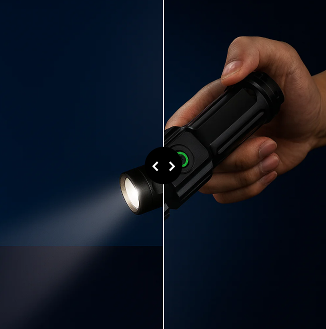 Avant : chemins flous, obscurité stressante, visibilité limitée. Après : faisceau ultra-puissant, zoom précis, détails nets à distance. Passez de l’incertitude à la sécurité totale grâce à LuminoX, compacte, résistante et rechargeable USB.
