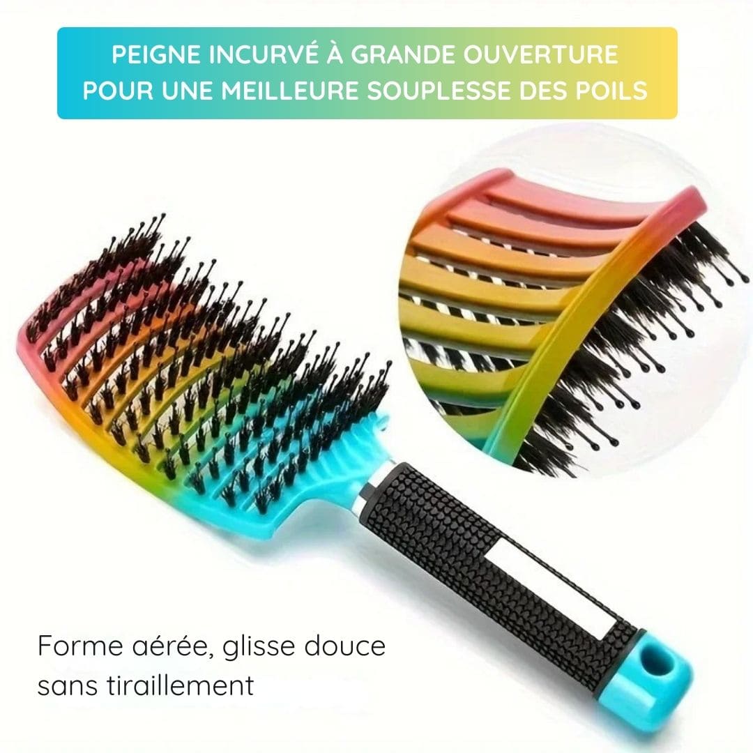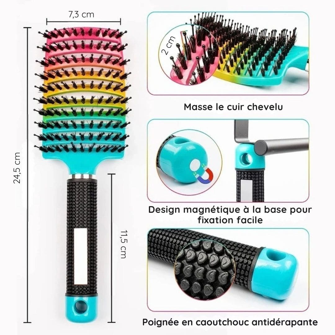 Cette brosse démêlante a été conçue pour éliminer les nœuds sans douleur, tout en massant le cuir chevelu. Grâce à ses poils en nylon souple, elle glisse dans les cheveux même les plus bouclés sans accrochage.