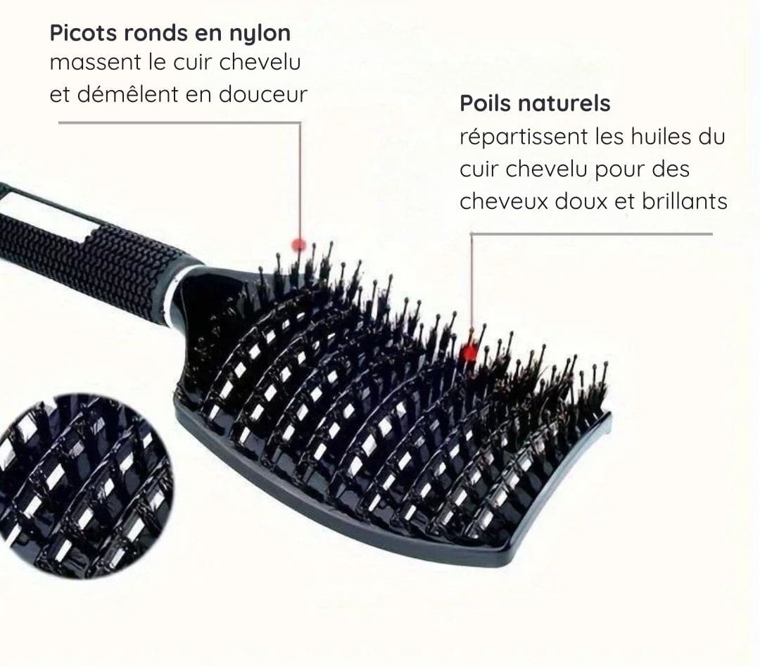 Les poils en nylon sont flexibles : ils se faufilent autour des nœuds plutôt que de les arracher. Le démêlage devient une expérience agréable, non traumatisante pour les cheveux ni pour le cuir chevelu.