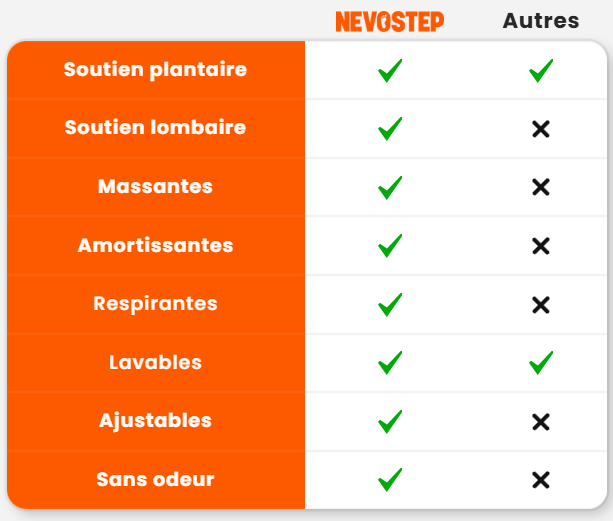 Marche, station debout, trajets… dites adieu aux pieds lourds et aux douleurs plantaires. NevoStep™ apporte un confort immédiat grâce à son soutien ciblé et son amorti efficace. Idéal pour le boulot, le sport ou les longues journées actives.